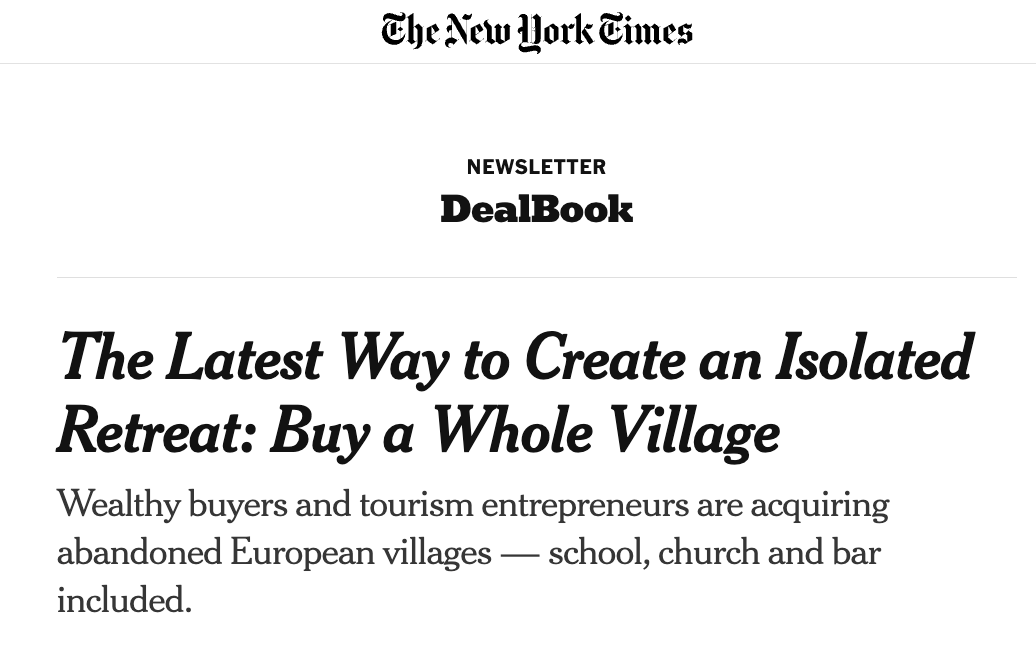 Un recente articolo pubblicato nella newsletter DealBook del New York Times ha acceso i riflettori su un fenomeno ormai evidente: in molte aree rurali d’Europa, borghi e villaggi abbandonati vengono acquistati e riconvertiti in luoghi di ospitalità, retreat aziendali e destinazioni per esperienze immersive.