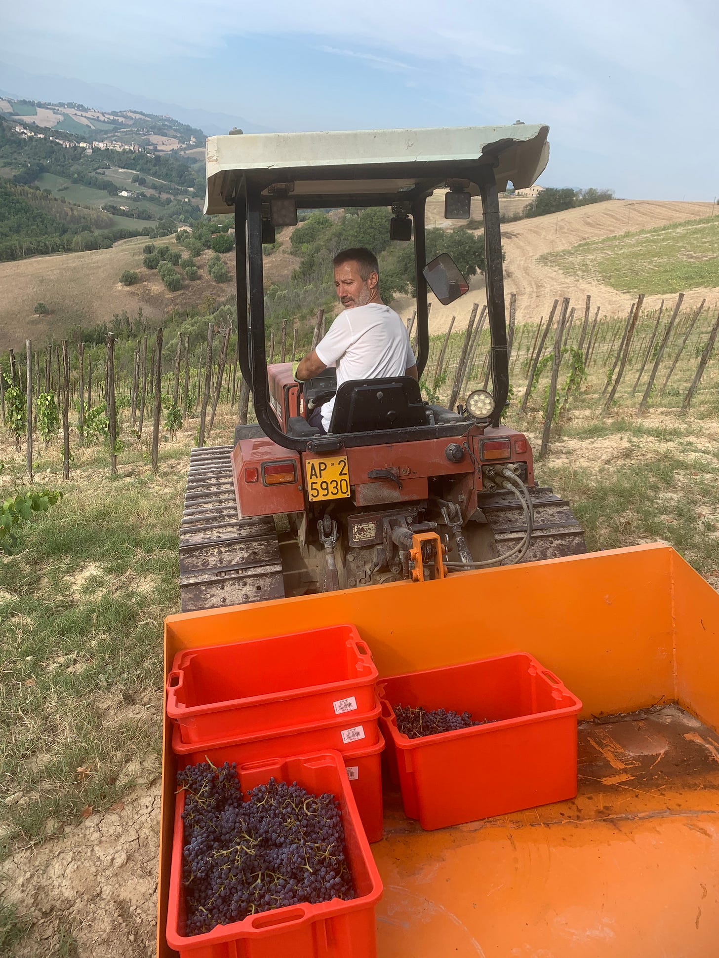On one side, a vineyard in Le Marche, harvests, an agricultural project growing slowly.
