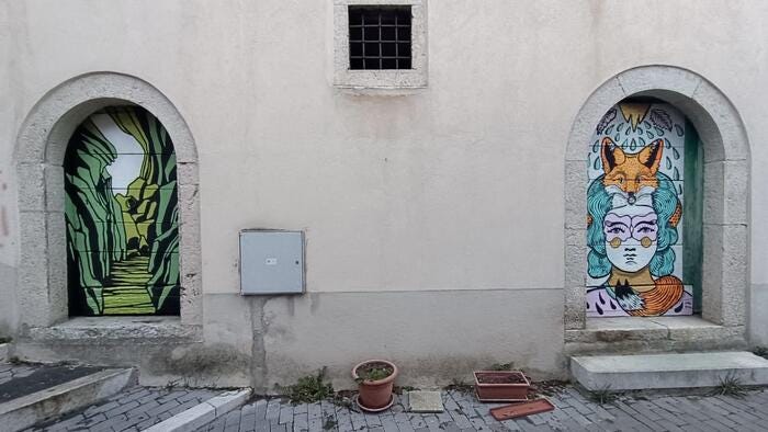 The result is the project known as “Portoni Narranti” — literally “Storytelling Doors” — a form of distributed street art that has turned Guardiaregia, a Molise village of just over six hundred residents, into an open-air art gallery. Here, the stories of the community are not displayed on information panels but painted directly onto the entrances of old houses, some of which are still inhabited.