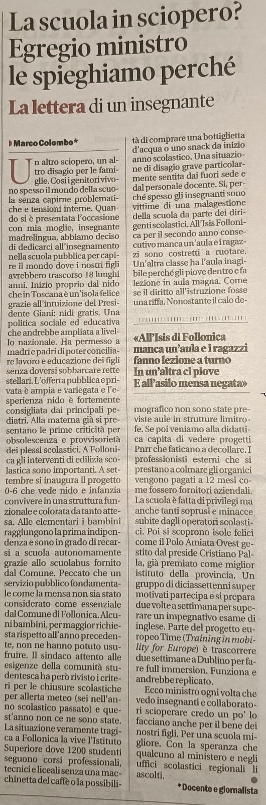 In an article published yesterday in the regional newspaper Il Tirreno, Colombo writes from the unusual perspective of being both a parent and a teacher, describing what it means to experience the Italian public school system from the inside in a town like Follonica.